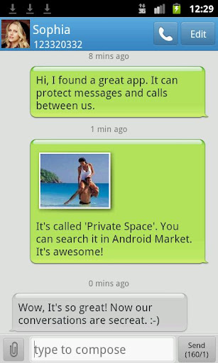 ¤¤ Current Version: 1.2.4 ¤¤ Requires Android: 2.1 up ¤¤ Category: Communication ¤¤ Size: 1.4M ¤¤ s t version: ¤¤ v1.2.7 ¤¤ 1. Optimize Contact Message UI. ¤¤ 2. Support chang name. ¤¤ 3. Fix some ce close issues. ¤¤ v1.2.6 ¤¤ 1. Optimize private message monitor. ¤¤ 2. Restore Contact comm cont menu when long-press a contact. ¤¤ v1.2.5 ¤¤ 1. lication wizard. ¤¤ 2. Support reset passcode by Ahencation Email. ¤¤ 3. Optimize UI. ¤¤ Details: ¤¤ Build private space ¤¤ Private Space a fantastic privacy protection hide contacts, messages l logs not want ors see. ¤¤ Have ever worried ab someone read private messages? Ever got a phone l at an awkward ? Ever worried ab someone check l logs casually purposely? ¤¤ Private Space helps ! ¤¤ Private Space sets up a personal space phone where any contacts . After , incom/go messages(SMS & MMS) l logs beten private contacts will be kept personal space with shown normal message box l log tory. ¤¤ s more, Private Space even hide icon of itself nobody will notice existence of Private Space. ¤¤ magic of Private Space: ¤¤ Be INVISIBLE except ¤¤ Hide private CONTACTS from stem address book ¤¤ Secure SMS & MMS by hid MESSAGES into Private Space ¤¤ Hide secret L LOGS block sensitive L at awkword ¤¤ ALERT a dummy SMS, vibrate play customized rtone when get messages phone l. be notified when messages ls arrive b know y really are ¤¤ Shake phone close PrivateSpace a hurry ¤¤ play: ¤¤ ¤¤